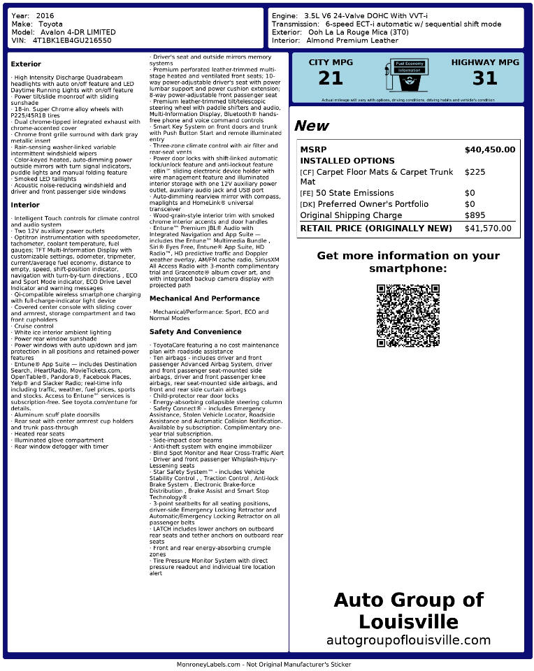 Hop into this vibrant Red 2016 Toyota Avalon and let the road be your canvas! With a powerful 3.5L V6 engine under the hood, this front-wheel drive sedan is ready to take on any adventure you have in mind. The sleek exterior boasts chrome accents and LED brakelights that will turn heads as you cruise by. Slide into the driver's seat and feel the luxury of the leather steering wheel and chrome accents throughout the interior.