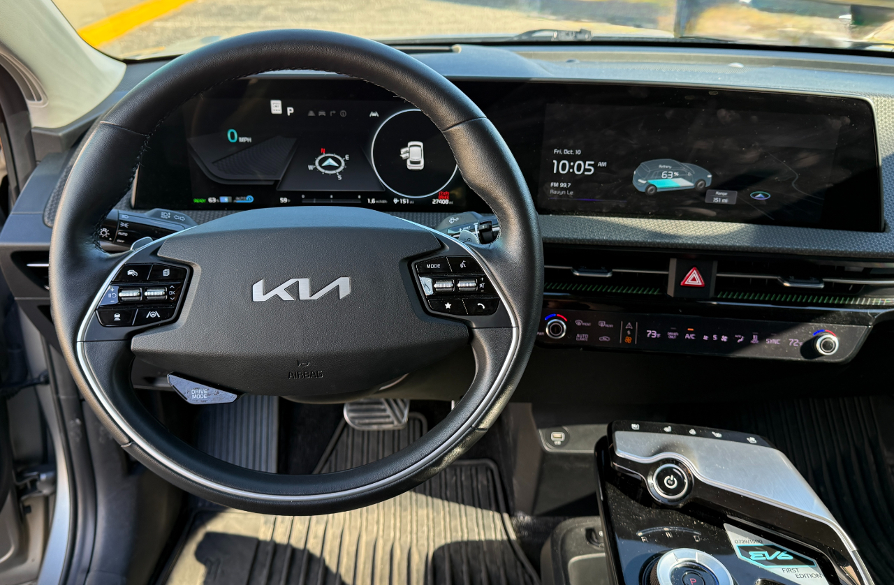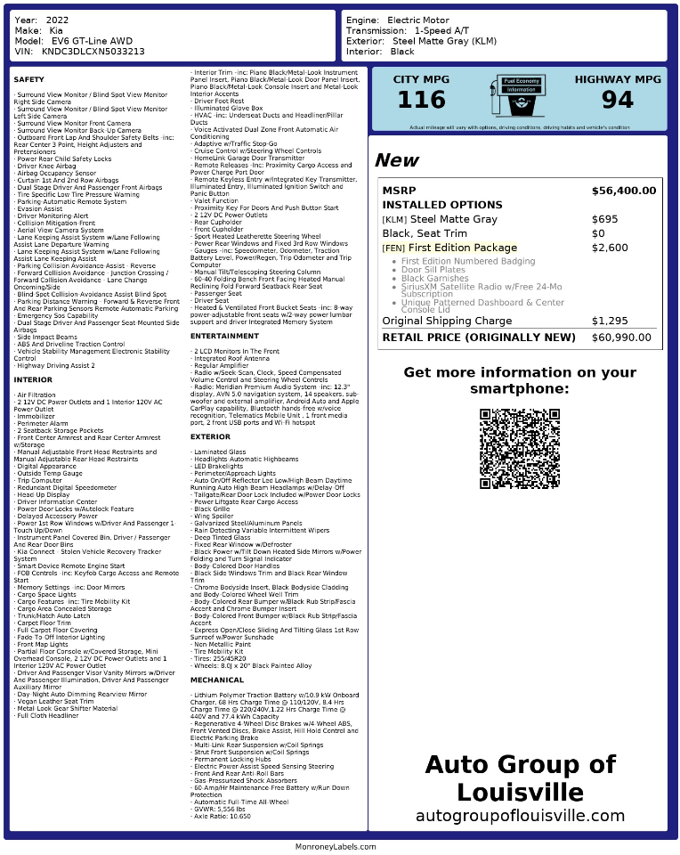 The striking Black exterior pairs perfectly with the 20" black painted alloy wheels, creating an eye-catching look that will turn heads wherever you go. Step inside the luxurious cabin and sink into the heated and ventilated front bucket seats, complete with a sporty heated leatherette steering wheel. With Kia Connect, Stolen Vehicle Recovery Tracker System, and an Aerial View Camera System, this EV6 is packed with advanced safety and technology features to keep you connected and secure on your journeys.